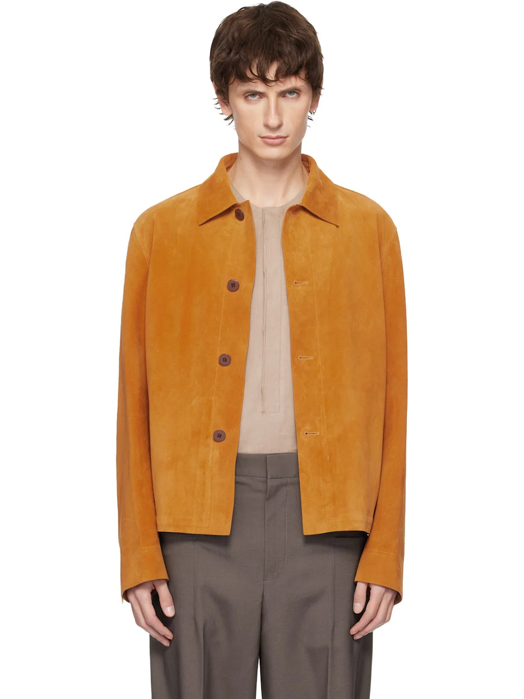 Calfskin suede jacket. · Spread collar · Button closure · Seam pockets at waist · Concealed button cuffs · Locker loop at back collar · Patch pockets at interior · Unlined Supplier color: Mustard Body: 100% calfskin. Pocket lining: 100% cupro. Made in Italy 252142M181000