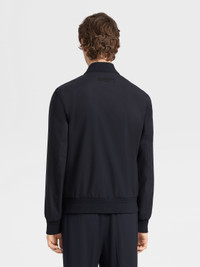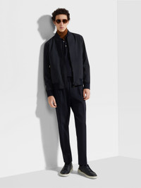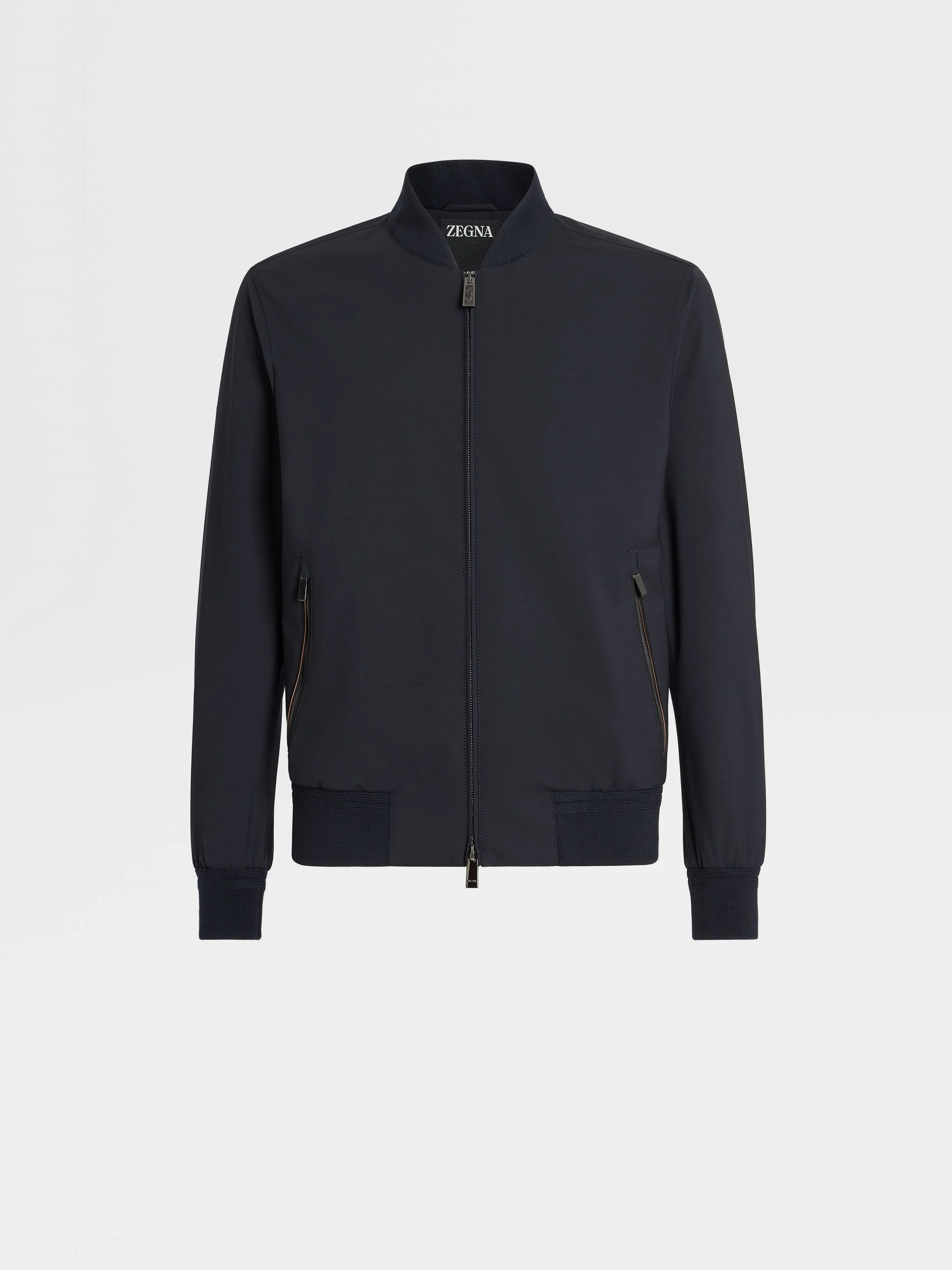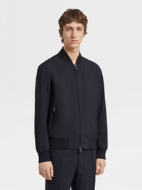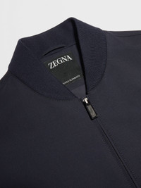 The navy blue Trofeo™ Elements wool bomber combines luxury materials with high-per... INFO Padded for extra warmth, the navy blue Trofeo™ Elements wool bomber is made from one of Zegna's most innovative materials: specially selected wool fibers are equipped with a water-repellent membrane to create a soft, lightweight, but very weather-resistant choice of outerwear. The classic bomber silhouette is finished off with a stand collar and ribbed trims. PRODUCT CODE E7T20-7100-531 MATERIALS AND CARE Main body: 100% Wool Leather details: Calfskin Lining: 100% Polyester The super-fine fabric of this luxurious garment features an innovative membrane that's specifically developed to ensure water resistance without compromising its natural softness and light weight. Do not wash. Do not bleach. Do not tumble dry. Iron at max 110°C. Professional dry cleaning in hydrocarbons, mild process. Professional leather clean only. Protect leather details before washing. Protect the metal accessories during washing. FIT AND PRODUCT DETAILS • Regular fit • Stand collar • Zip closure • Ribbed hem • Leather details • Zipped pockets • Water repellent • 66 cm length on size 48 • Model is 187 cm tall (6.1 feet) and wears an Italian size 48.