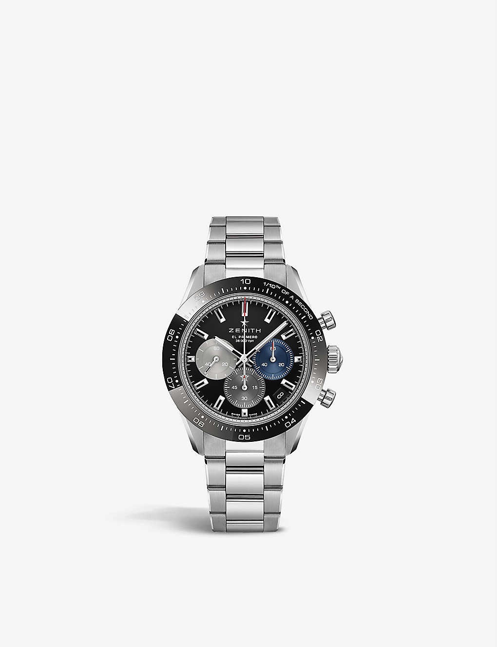 PRODUCT DETAILS - Zenith stainless-steel and ceramic automatic watch - Style no: 03.3100.3600/21.M3100 - Stainless steel and ceramic - Deployment buckle - El Primero 3600 calibre, 60-hour power reserve, automatic movement, sapphire crystal glass - Water resistance: 10 bar / 10 atm / 100 m / 330 ft - Made in Switzerland - Two-year manufacturer's warranty - Case size: 41 mm