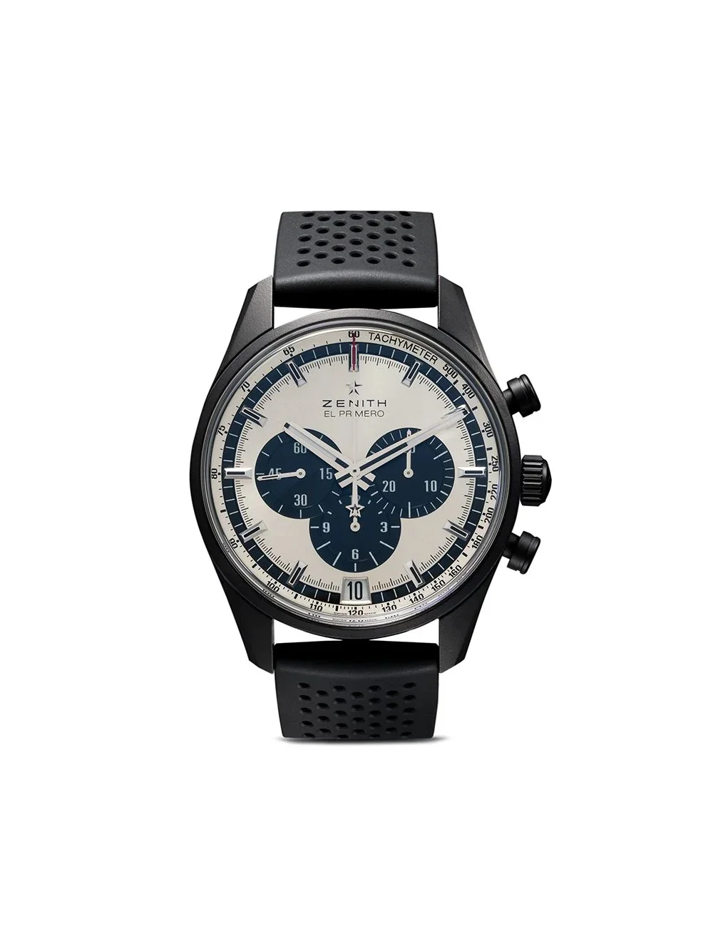 Chronomaster El Primero 42mm Zenith’s Chronomaster collection proves their mastery in the art of precision-based timekeeping with immaculately-complex technology, a furious beat and a sleek design. Crafted in Switzerland from matte black ceramicised aluminium, the Chronomaster El Primero 42mm houses the automatic El Primero 400 B column-wheel chronograph with 326 components, 31 jewels and frequency of 36,000 VpH. The watch features a 50h power reserve, 10 ATM water resistance, silver-toned sunray-patterned dial with black counters, domed sapphire crystal face, tachymetric scale on the inner bezel ring and black rubber strap with a PVD-coated titanium clasp. Functions include a central chronograph, 12-hour counter at 6 o’clock, 30-min counter at 3 o’clock, central hours and minutes, small seconds at 9 o’clock and a date indication at 6 o’clock - all of which are rhodium-plated and coated with SuperLuminova for added practicality. This item comes with a standard 2-year international warranty from the brand. Imported Composition Outer: Aluminium 100%, Rubber 100%, ceramic 100%, Titanium 100% SIZE & FIT Measurement Strap width 0.78 in(20 mm) Minimum strap length 7.83 in(19.9 cm) Case thickness 0.51 in(13 mm) Maximum strap length 9.44 in(24 cm) Case size 1.65 in(42 mm)