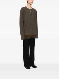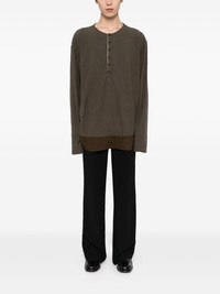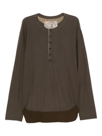 henley neck long sleeve T-shirt Highlights - Khaki - Front button fastening - Henley neck - Long sleeves Imported Composition Outer: Cotton 100% Silk 53%, Linen/Flax 47% Lining: Cupro 50%, Cotton 50% SIZE & FIT Model measurements Height 6 ft 2 in(1.87 m) Bust/Chest 33.07 in(84 cm) Hips 35.43 in(90 cm) Waist 26.77 in(68 cm) FittingInformation Designed for an oversized fit, offering additional room throughout Constructed with additional length on the sleeve Made from a midweight non-stretch fabric, this piece offers minimal elasticity when worn Washing instructions Hand Wash
