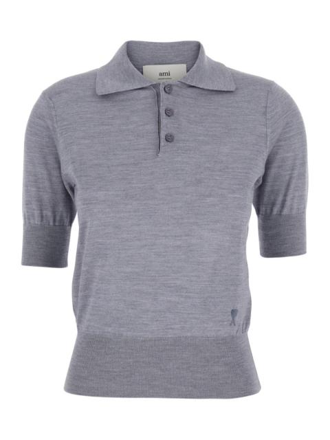 Ami Paris Women Grey Polo Shirt With Classic Collar And Logo Embroidery On The Front In Wool And Sil