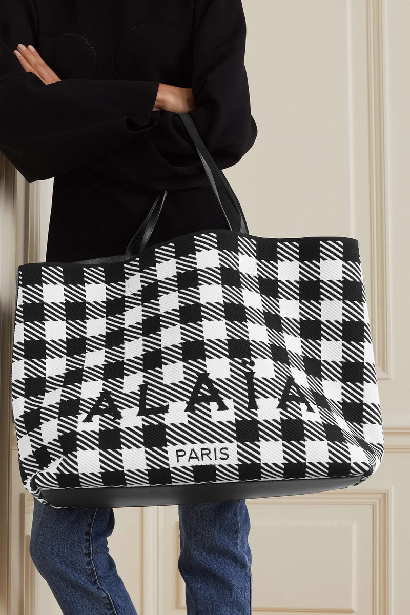 Large leather-trimmed houndstooth jacquard-knit tote