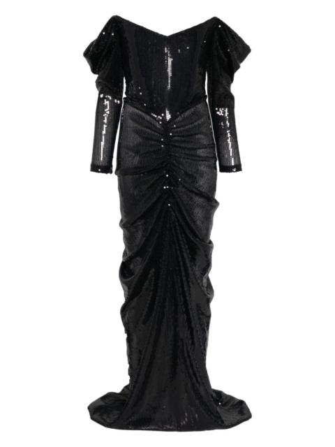 Sequined Mesh Long-Sleeve Draped Backless Asymmetric Gown