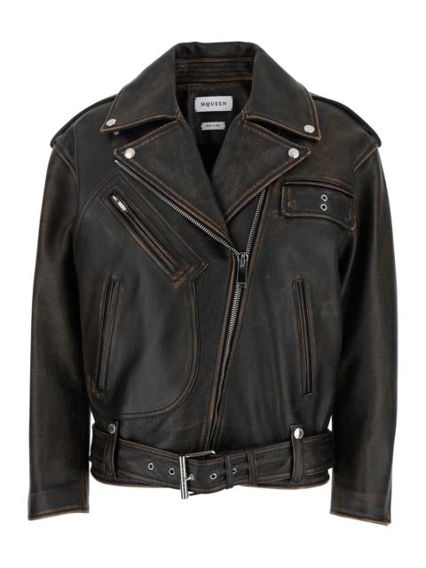 Alexander Mcqueen Women Antiqued Brown Biker Jacket With Wide Classic Lapels And Decentralized Zip C
