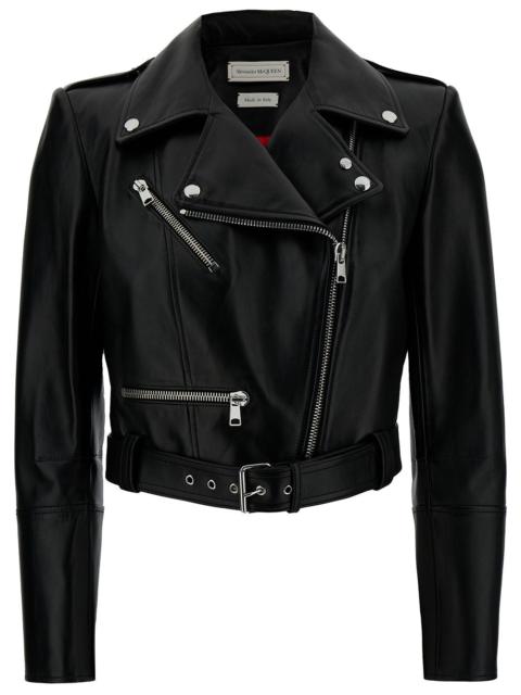 Alexander Mcqueen Women Black Cropped Biker Jacker With Matching Belt In Smooth Leather Woman
