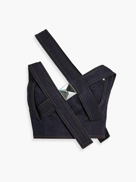 One-shoulder cropped embellished denim top