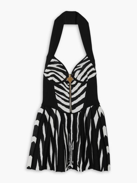 Zebra-jacquard zip-embellished ribbed-knit mini dress