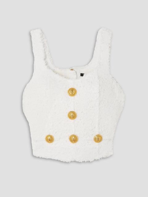 Button-embellished bouclé-tweed bustier top