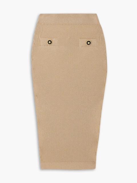Button-embellished ribbed-knit midi skirt
