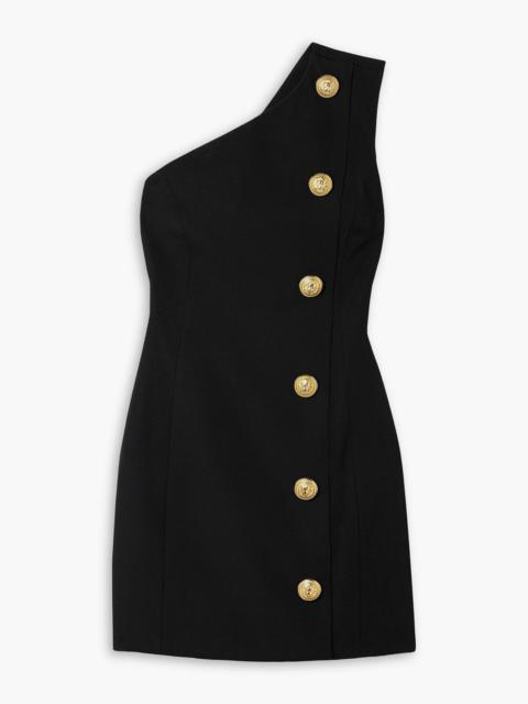 One-shoulder button-embellished grain de poudre wool mini dress