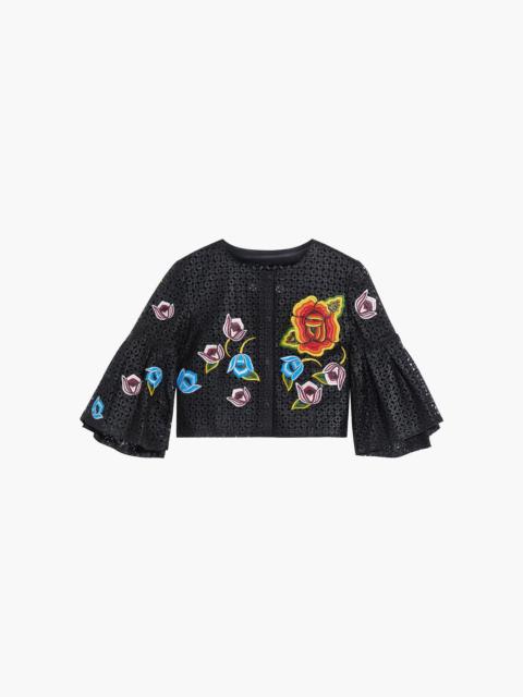 Cropped floral-appliqued laser-cut leather jacket