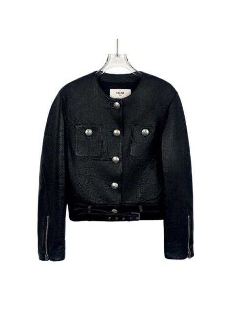 Celine Womens Black Lambskin Leather Buttoned Jacket With Belt & Zipper Details