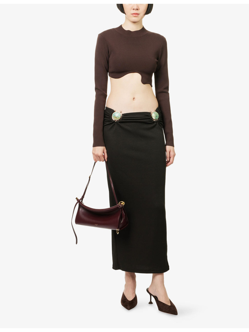 Mineral Stone Embellished Ruched Ribbed Jersey Midi Skirt
