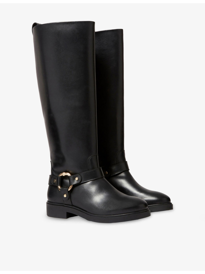 Buckle-Hardware Leather Knee-High Boots