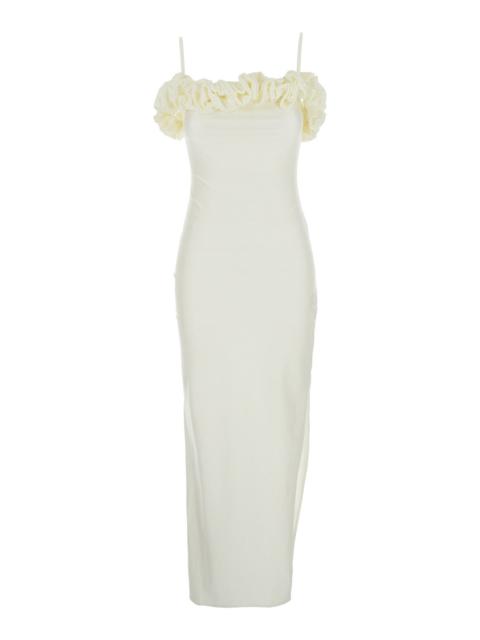 Off-the-shoulder zip-embellished ruffled chiffon midi dress