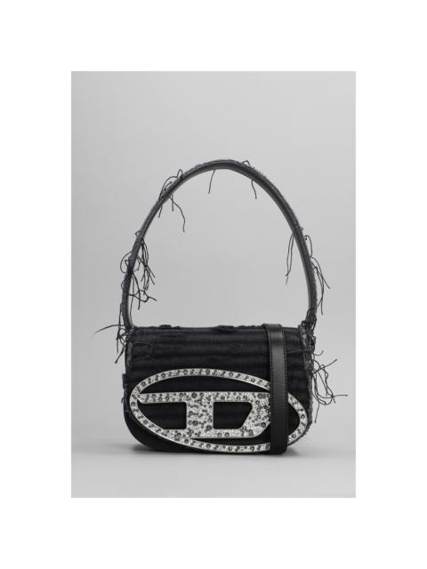 Diesel Women '1Dr' Black Shoulder Bag With Oval D Plaque With Rhinestones And Fringed Edges In Cotto