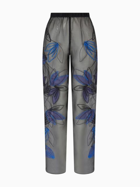 Pure silk organza elasticated-waist trousers with floral embroidery