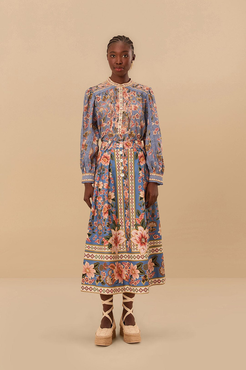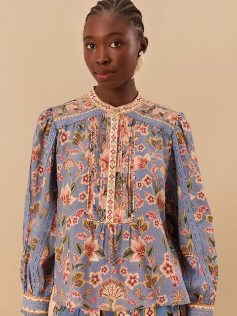 Turquoise Palm Tree Tapestry Blue Wavy Yoke Blouse