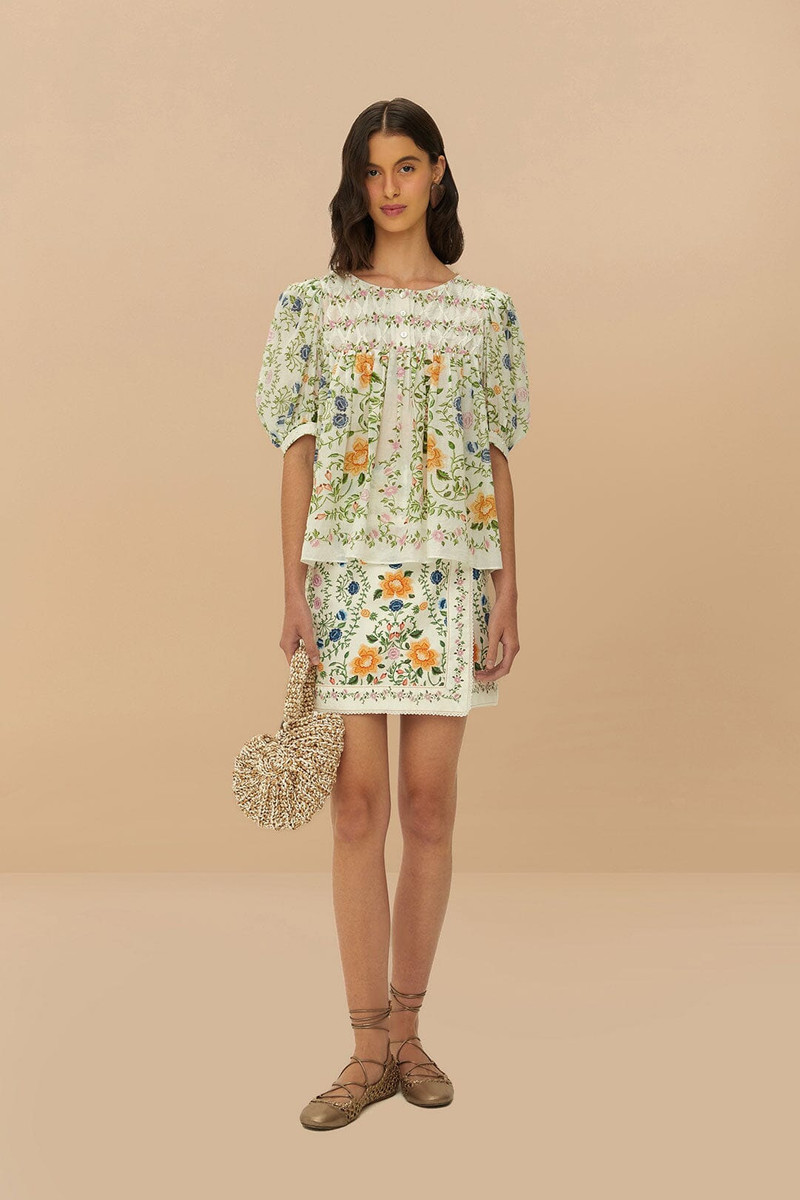 Folk Floral Off-White Scoop Neck Short Sleeve Blouse