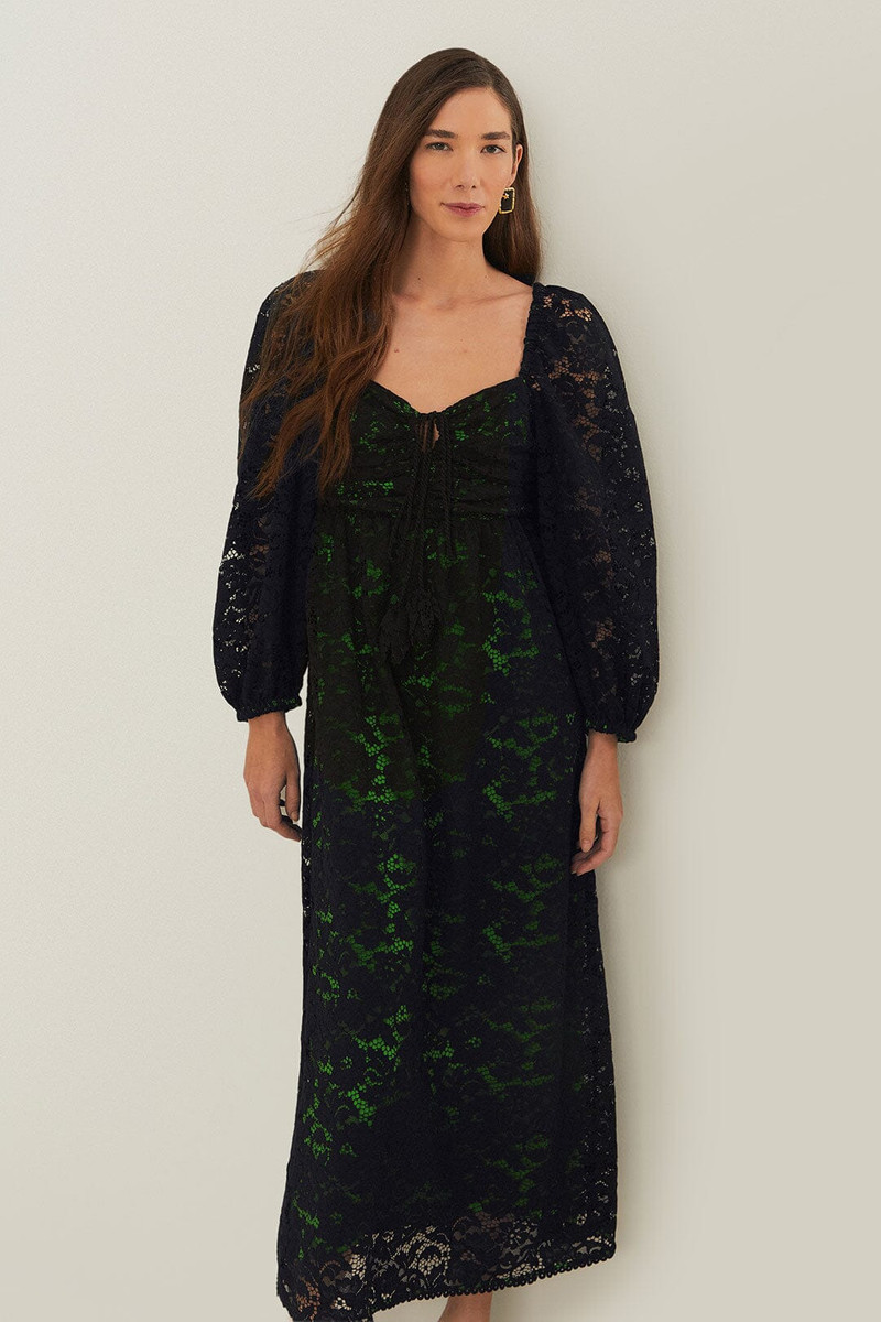 Black Embroidered Flowers Organic Cotton Midi Dress
