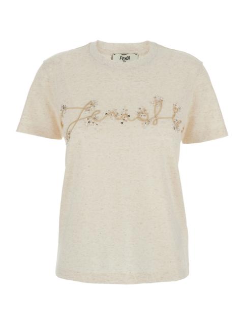 Fendi Women Beige Crewneck T-Shirt With Logo Embroidery On The Front And Rhinestone Details In Cotto