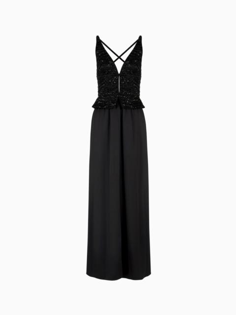 SILK BLEND LONG DRESS WITH RHINESTONE EMBROIDERY