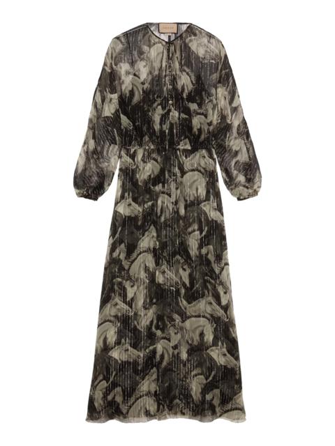 Green Floral Check-Print Ruffled Silk-Crepe Gown