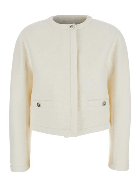 Gucci Women White Collarless Cropped Jacket With Gg Logo Button In Bouclé Wool Woman