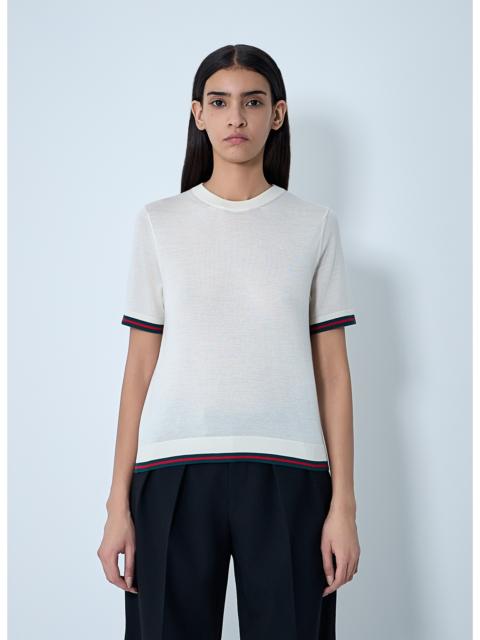 Gucci Women Blue T-Shirt With Web Detail On The Edges In Cashmere And Silk Blend Woman