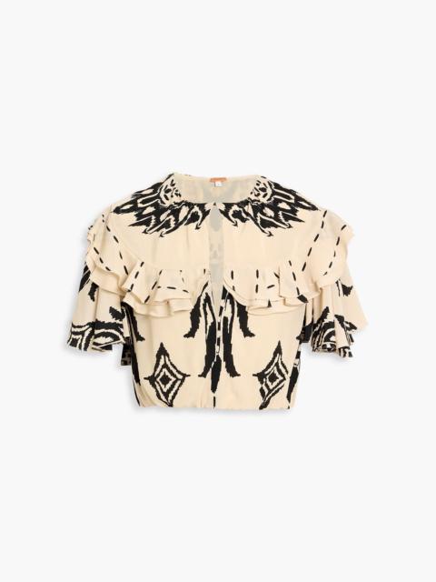 Influential Tribes cropped ruffled printed silk-crepe top