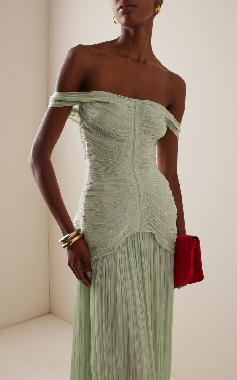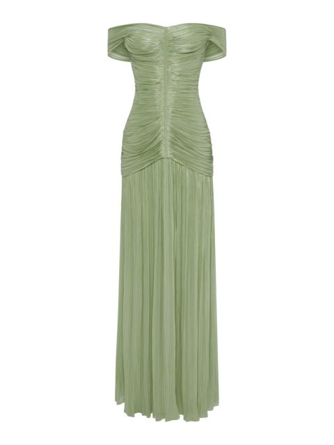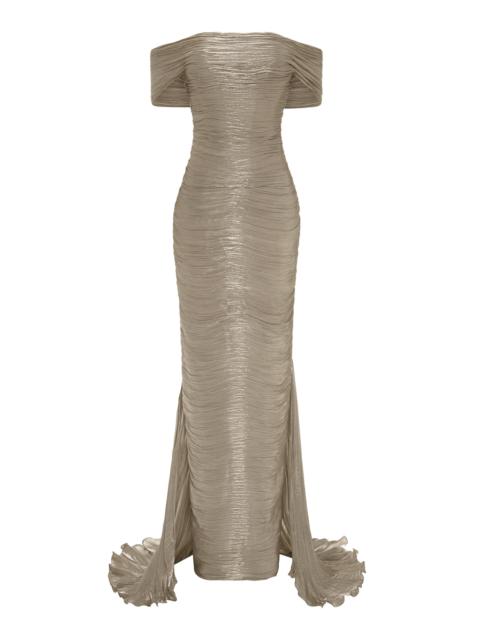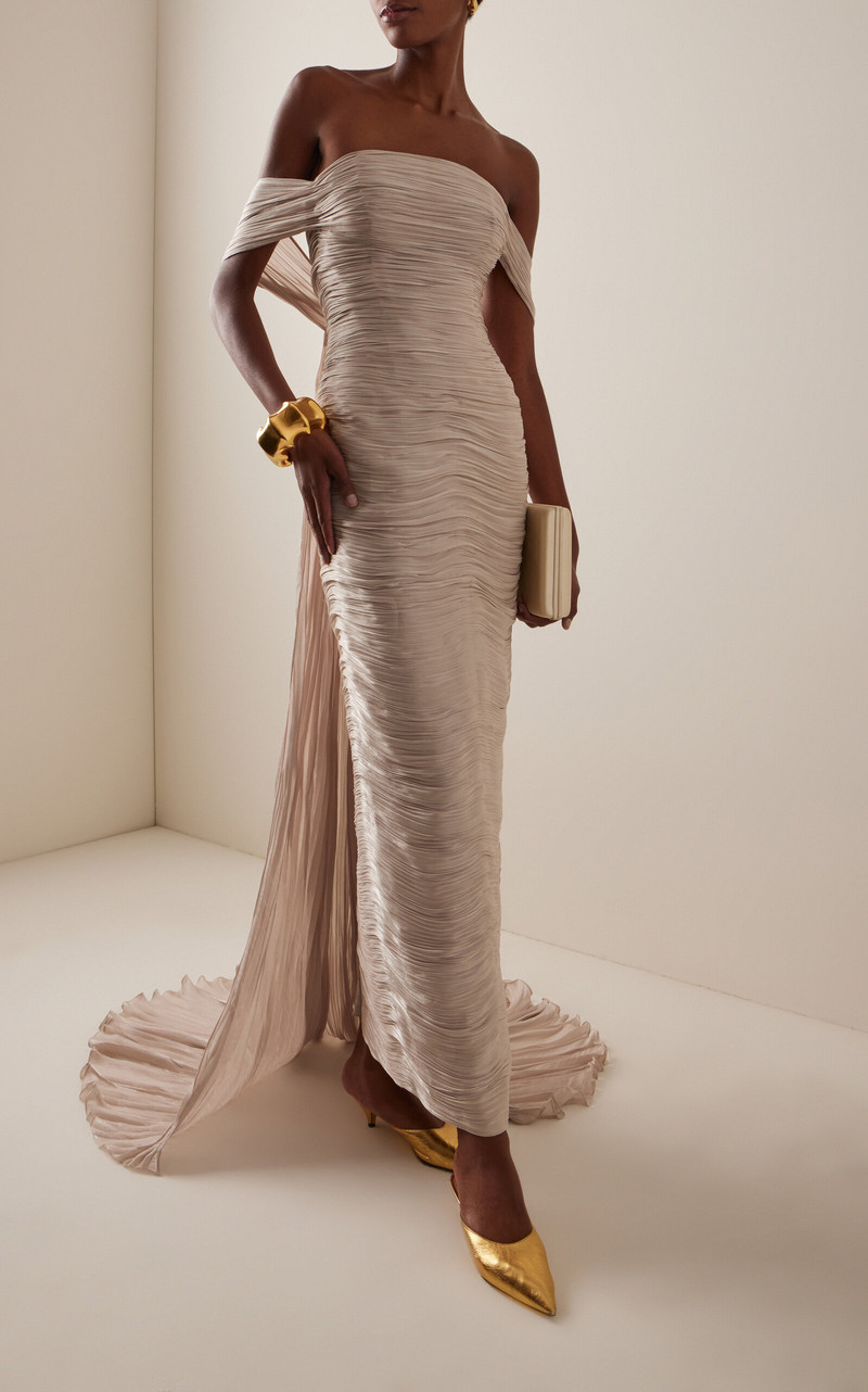 Ruched Silk Satin Off-The-Shoulder Gown grey