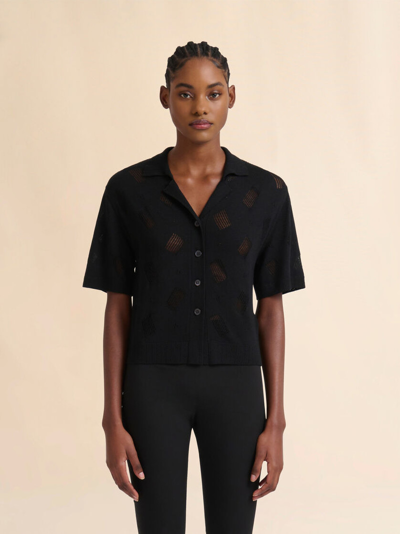 BLACK WOOL-SILK KNIT OPENWORK SHIRT