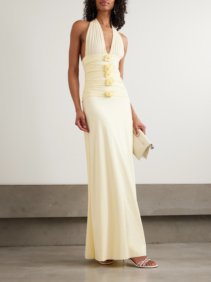 Veranera Appliquéd Ruched Cutout Stretch-jersey Halterneck Maxi Dress