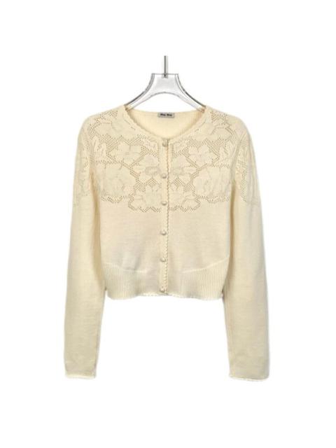 Miu Miu Womens Virgin Wool Knit Cardigan Sweater With Floral Lace Detail Button