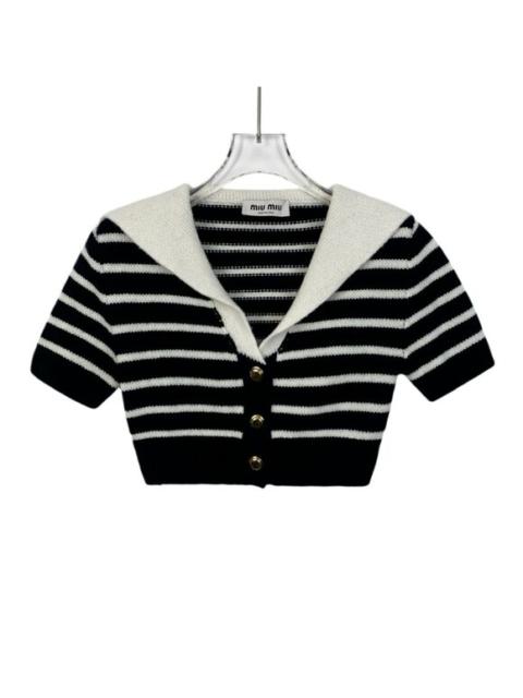 Miu Miu Striped Collar Knit Cardigan Sweater Black & White Short Sleeve Button F