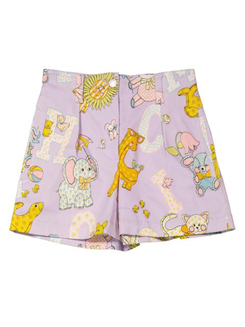 Moschino Ladies Purple All Over Logo Circus Print Shorts, Brand Size 38 (US Size 4)