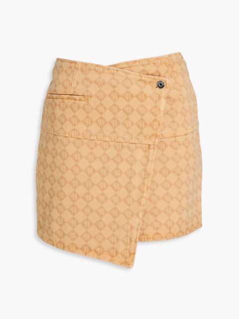 Asymmetric logo-print denim mini wrap skirt