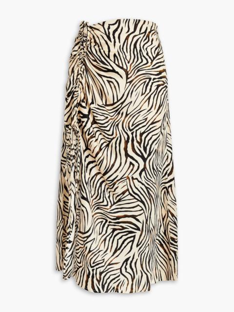Ruched zebra-print satin midi skirt