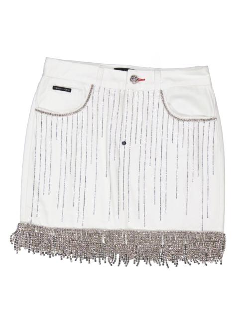 Philipp Plein White Crystal Fringe Denim Skirt