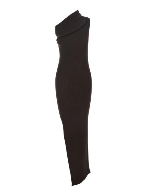 Rick Owens Women 'Athena' Brown Ribbed Knit Sleeveless Asymmetric Long Dress With Wide Neckline In V