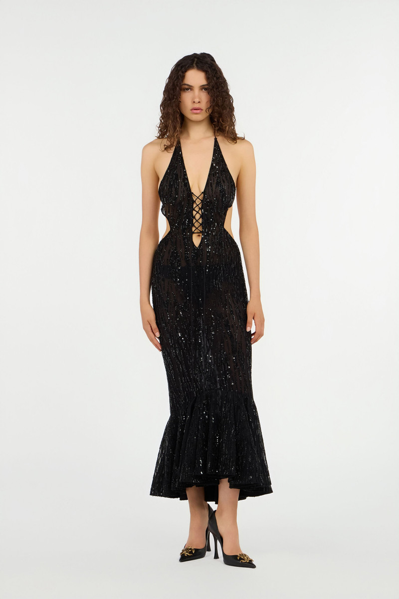 Beaded Cutout Matte Jersey Long-Sleeve Mini Dress