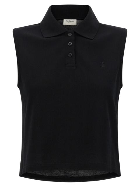 Saint Laurent Women Black Sleeveless Polo Shirt With Classic Collar And Cassandre Embroidery On The