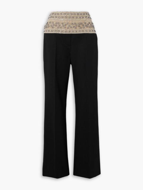 Crystal-embellished mesh-trimmed wool-twill straight-leg pants