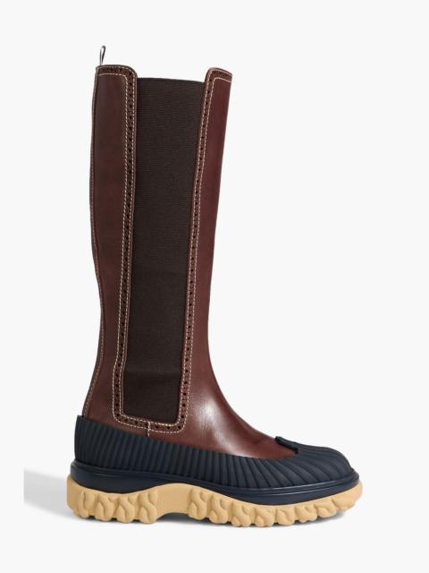Leather-trimmed printed knitted sock boots