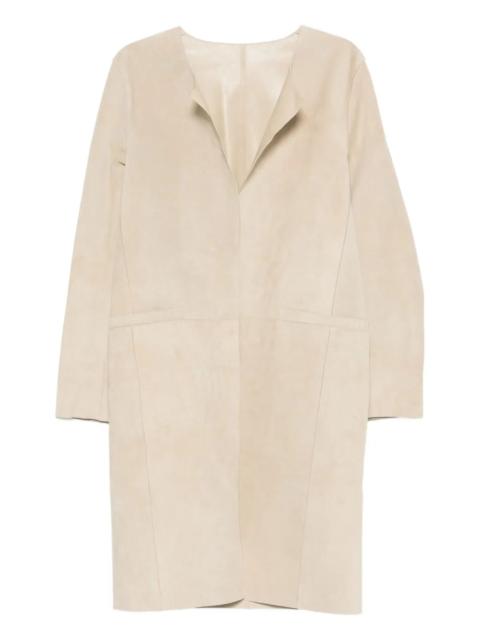 Collarless Suede Coat in Peanut