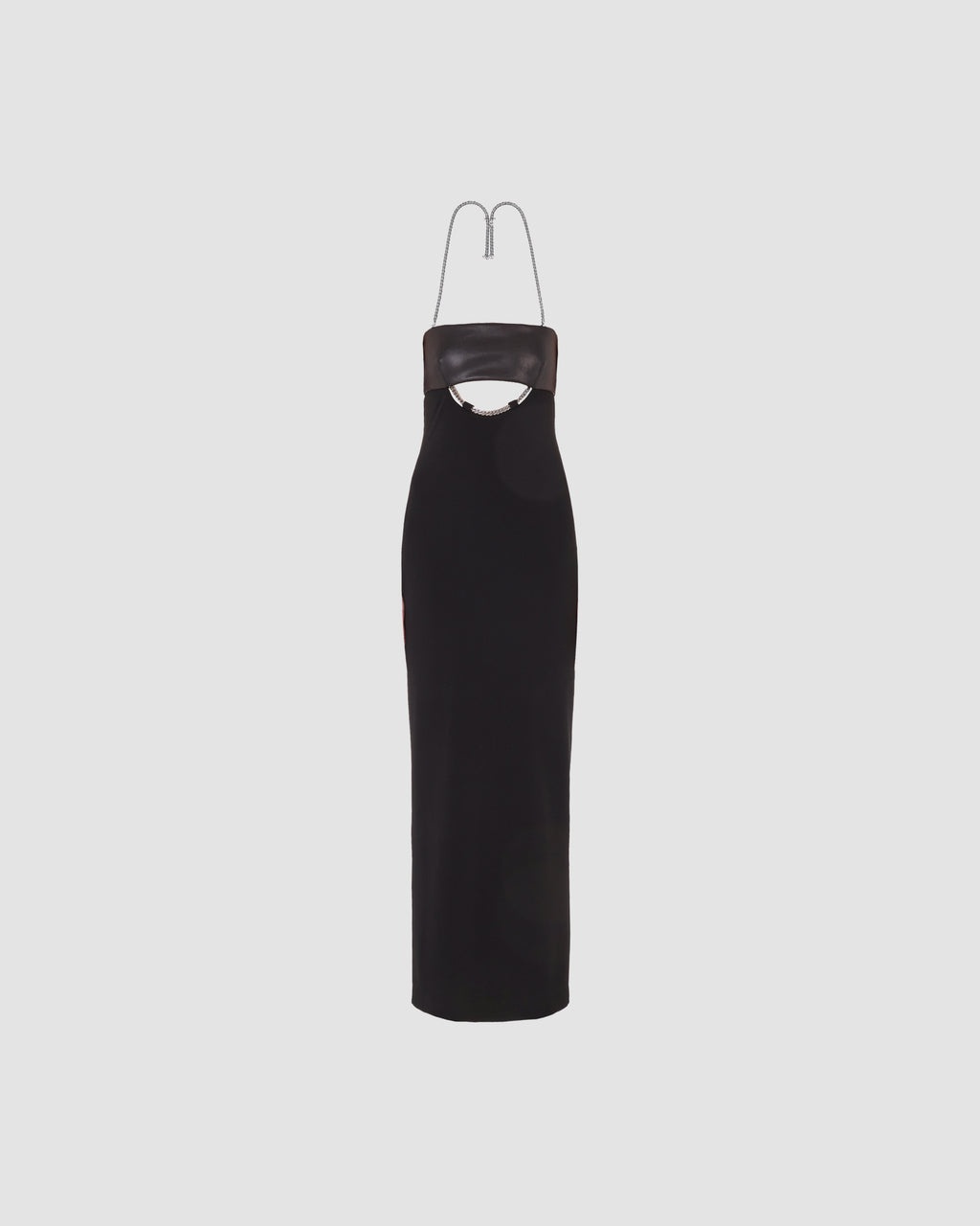 Cut out midi dress in jersey with leather band and chain neck. Features chain details on the back. Color: Black - Made in Italy - 98% Viscose, 2% Elastane - Insert: Lamb Leather - True to size - Model is wearing size S