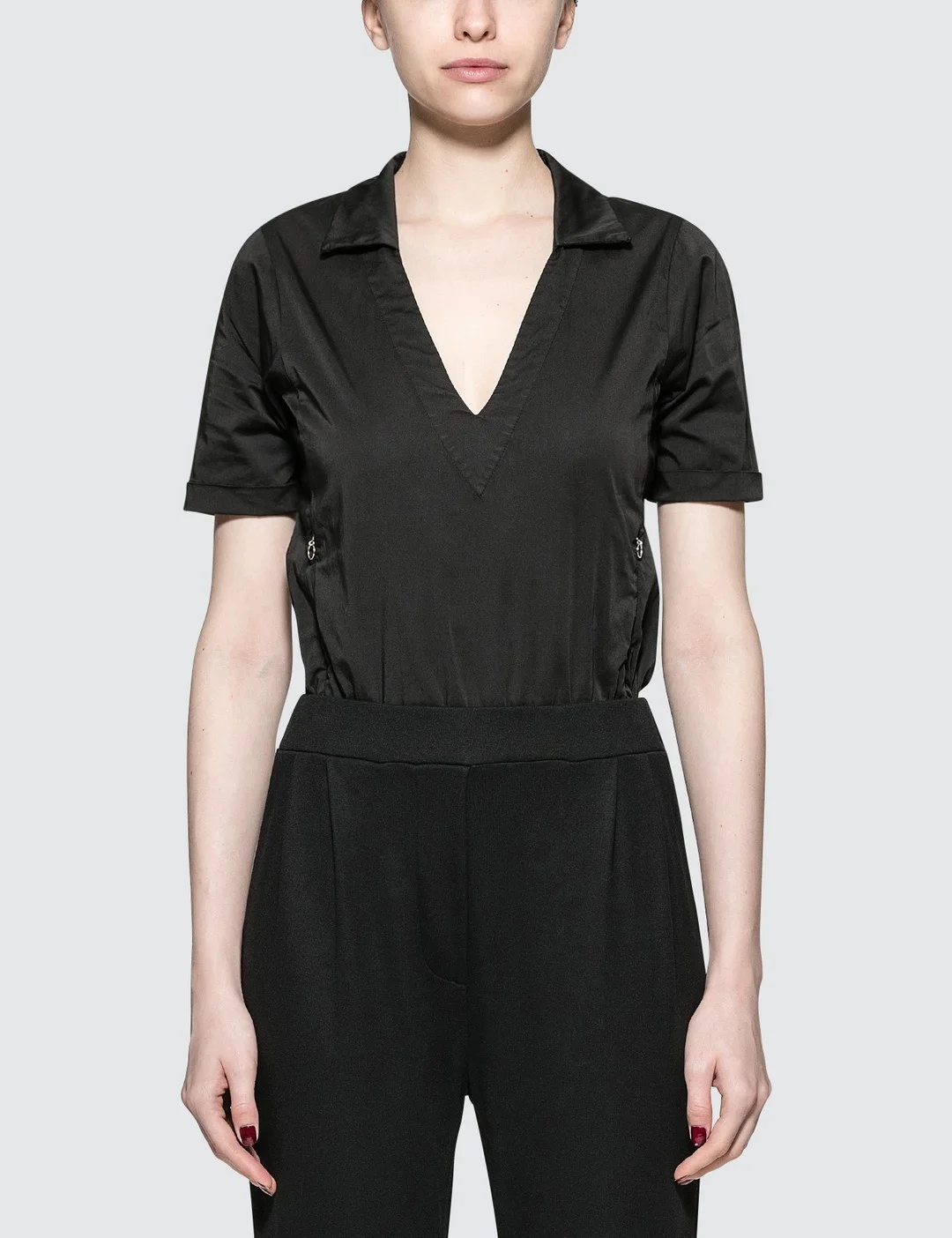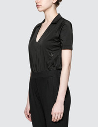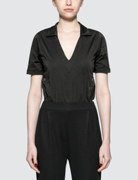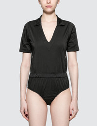 - 1017 ALYX 9SM - Bodysuit - Short sleeve - V neck - Spread out collar - Zipper detail on side - Elasticated waist - See more Bodysuits and Clothing SIZING - Fits true to size, take your normal size - Designed to be worn fitted - Model wears size S - Model measures: Height 177cm, Chest 34”/86cm, Waist 24”/61cm, Hip 35”/88cm