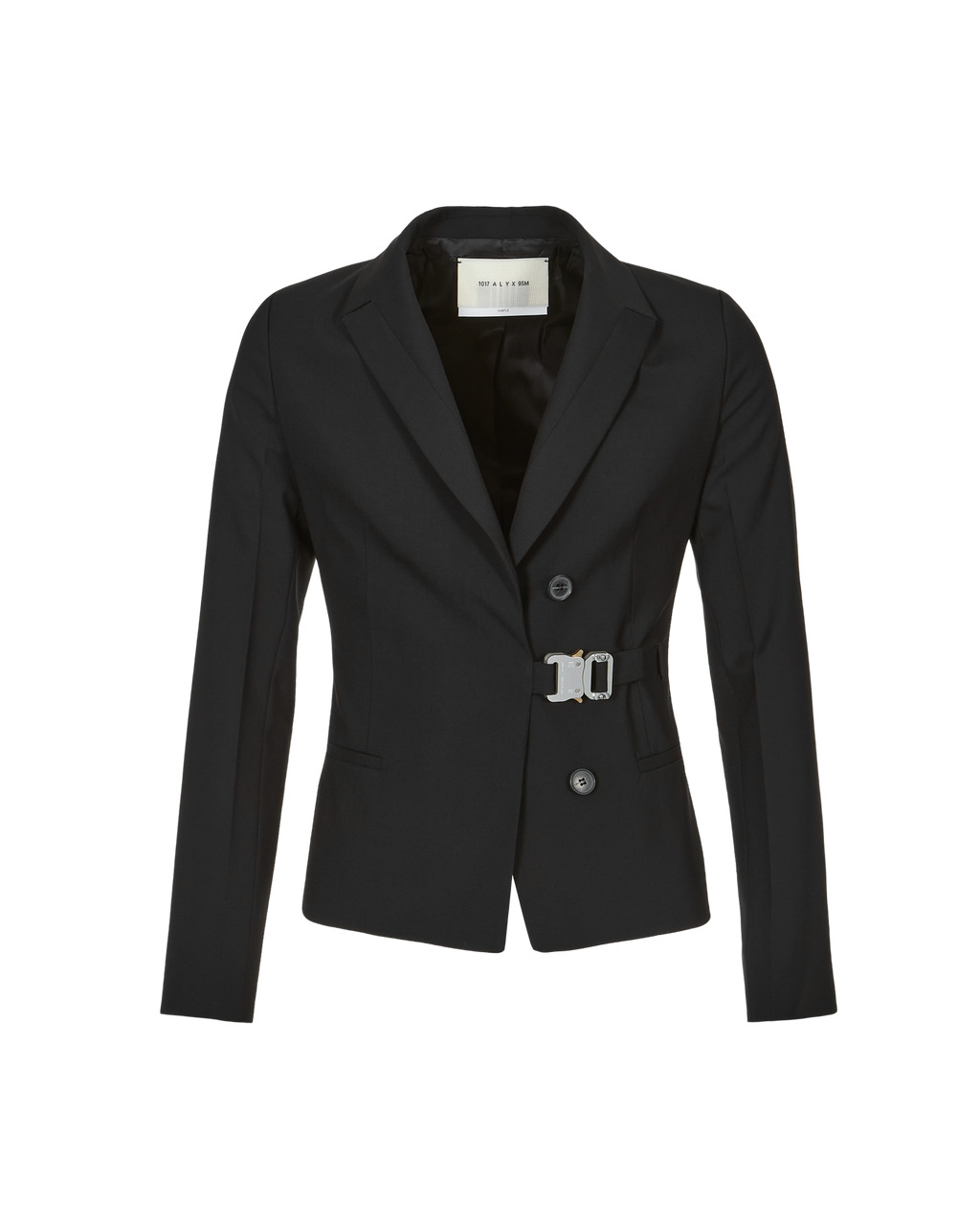 Fitted blazer with signature rollercoaster buckle. Color: Black - Self: 54% Wv, 45% Pl, 1% Ea