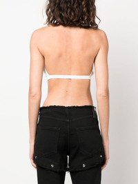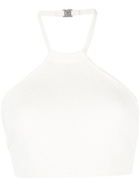 cropped halterneck knit top Highlights - White - Bird's eye knit - Halterneck - Buckle fastening - Backless - Cropped Made in Italy Composition Viscose 100% SIZE & FIT Model measurements Height 5 ft 9 in(1.76 m) Bust/Chest 33.07 in(84 cm) Hips 34.64 in(88 cm) Waist 25.59 in(65 cm) FittingInformation Designed for a close fit throughout Made with a midweight knit, this piece offers some stretch This piece fits true to size – take your usual size